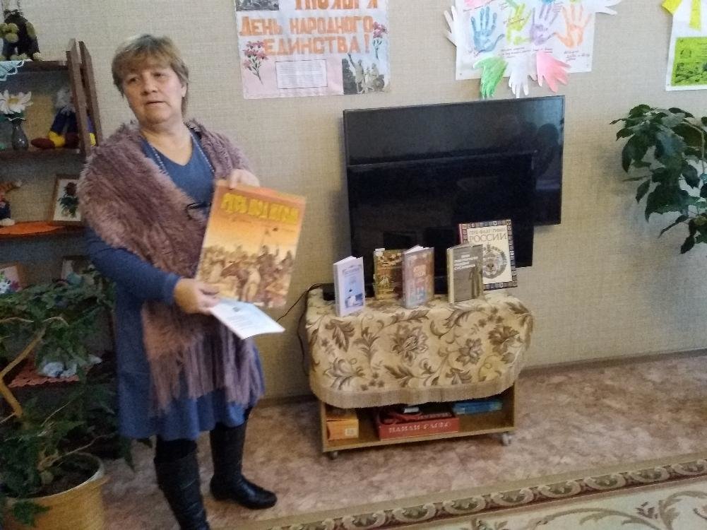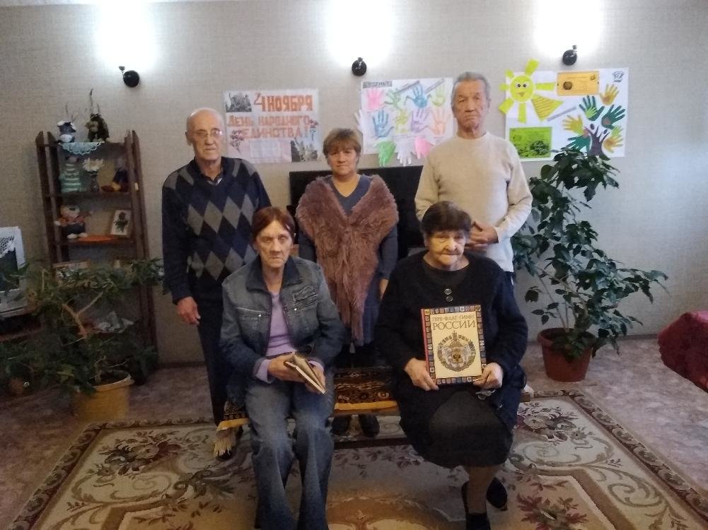 В гости к получателям социальных услуг пришла заведующая библиотекой с.Торчино Назарова Антонина Вячеславовна . Она дала общее представление об истории возникновения праздника , познакомила с исторической литературой, приняла участие в викторине «Знаешь ли ты историю России?» , посвященной Дню народного единства. Победителями среди мужчин стал Жильцов Виктор Александрович , а женщин – Киселева Мария Федоровна .Затем знакомство с историей России продолжилось для мало-мобильных получателей социальных услуг.