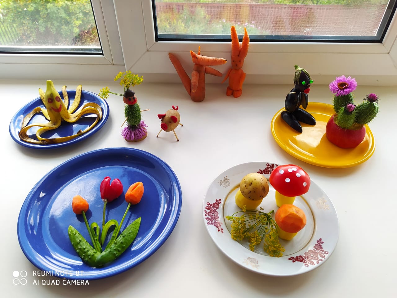 В своих работах проживающие использовали разные природные материалы: огурцы, морковь, картофель, помидор, яблоко, банан, баклажан, цветы и веточки. Поделки выполнялись в техниках аппликация и моделирование.