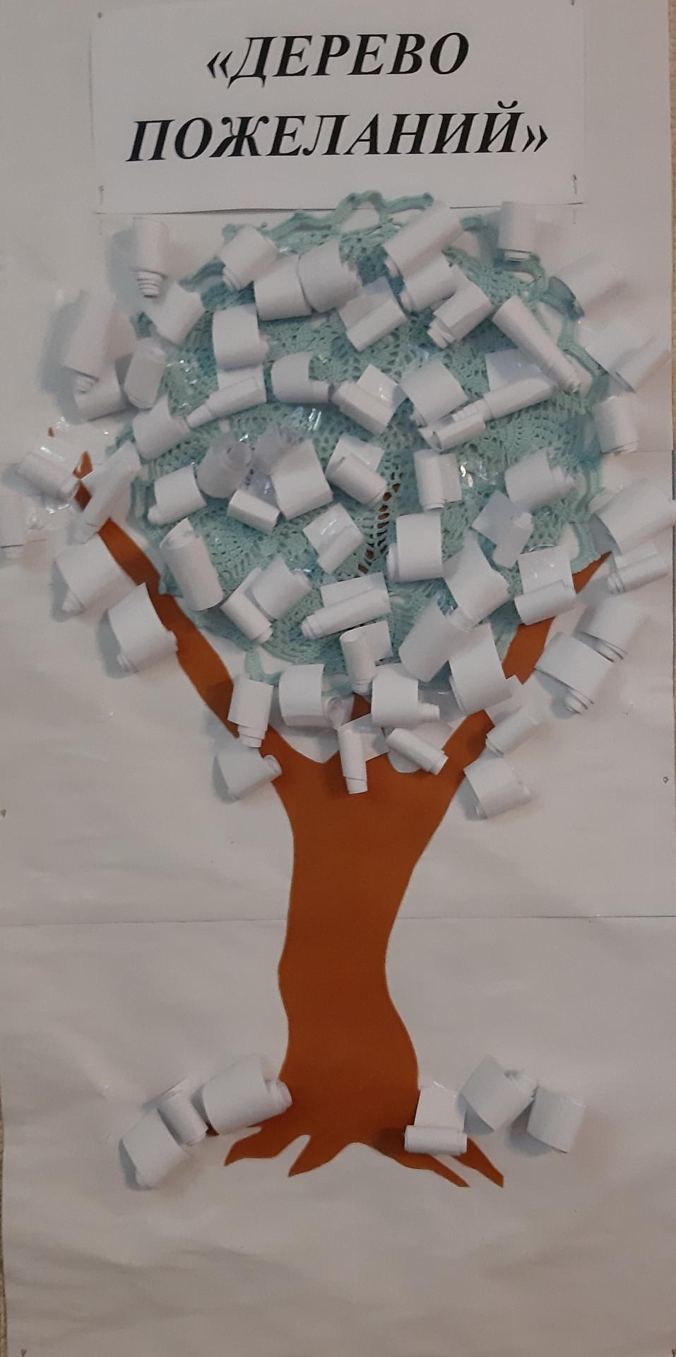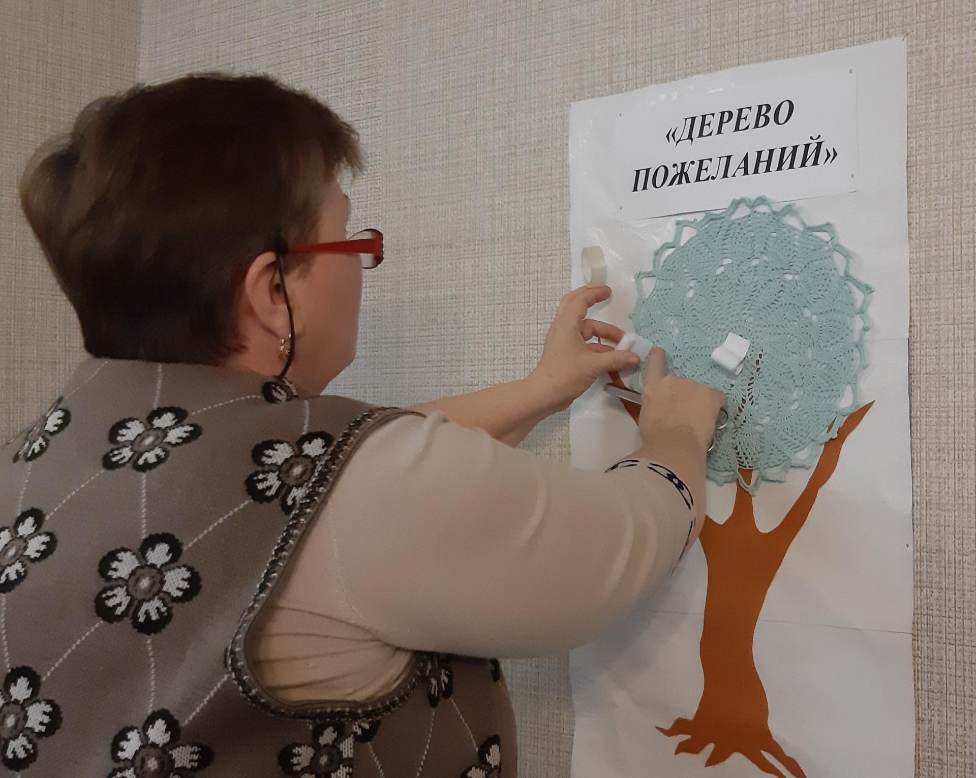 В течении всего занятия получатели социальных услуг писали на бумажных ленточках пожелания друг другу, друзьям и сотрудникам. Все записки приклеивали на Дерево пожеланий , размещенном в комнате отдыха. Все желающие перечитывали эти послания.