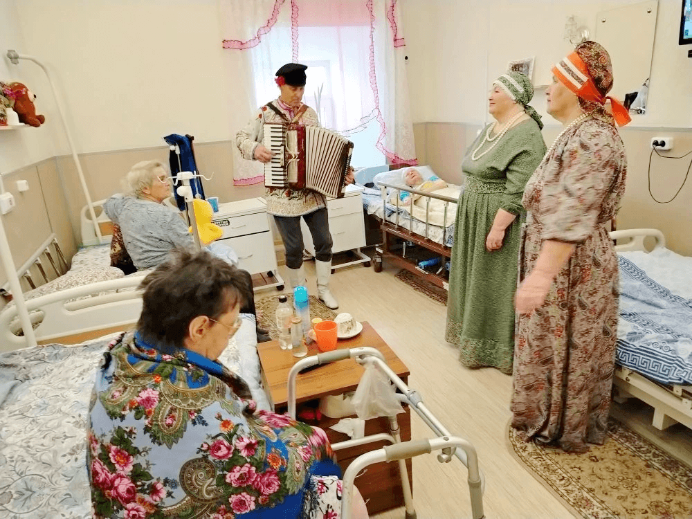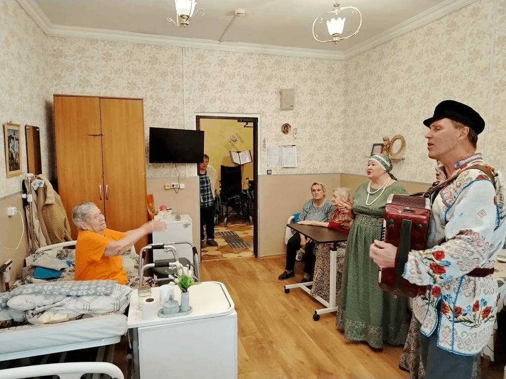2 апреля в Суздальском доме-интернате повсюду звучала музыка — ансамбль «Звонница» с баяном прошёл по всем комнатам, где живут маломобильные жители, которые могут передвигаться только в пределах кровати или комнаты. Для многих из них этот день стал по-настоящему особенным.